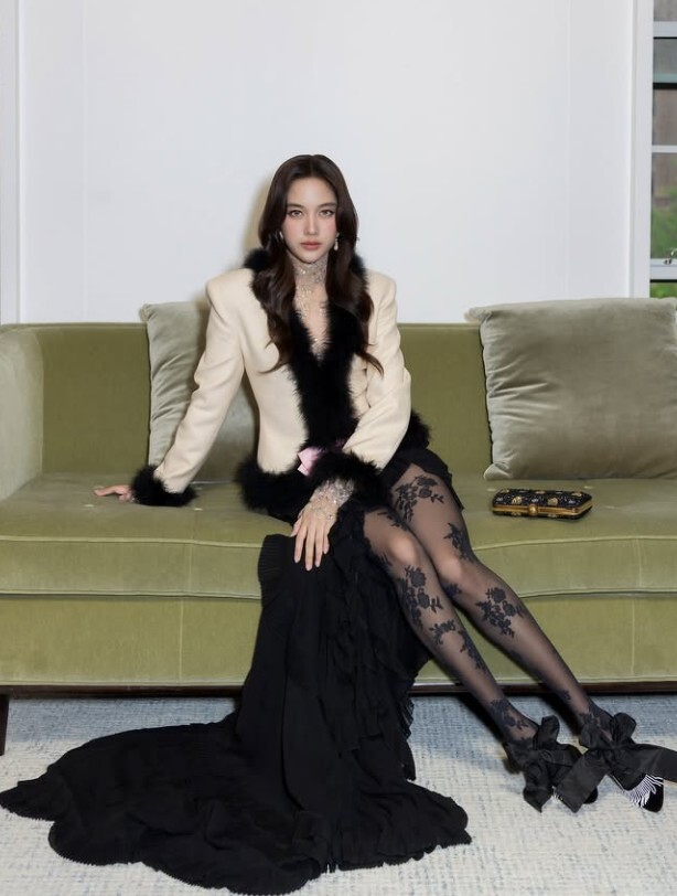 昨夜,Freen以Valentino订製造型亮相Met Gala红毯,成为首位踏上该红毯的泰国女星。他选择了一套蛋壳色绒毛滚边西装外套,搭配粉色蝴蝶结细节,优雅俏皮并存。裙摆以高开衩长裙设计,内衬蕾丝紧身裤与镶宝石装饰,在柔美与张力之间取得完美平衡。Freen的亮相不仅惊艳众人,更让他成功登上当晚的热搜榜单,成为2025年Met Gala的一大亮点。